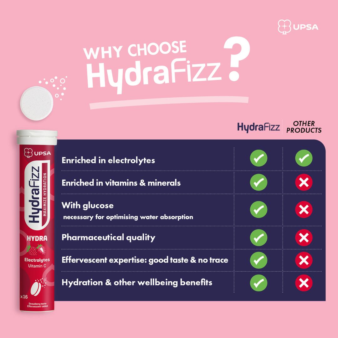 Because your health is our priority, UPSA Laboratories have formulated Hydrafizz with high-quality ingredients, rigorously selected for effectiveness and compliance with the most demanding European standards. Each tablet guarantees excellent performance and optimal hydration. The enriched formular of our hydrating tablets with their delicious strawberry flavour also meets the needs of your daily marathon: the vitamin C selected by UPSA helps reduce fatigue and the normal functioning of your immune system for even greater well-being.