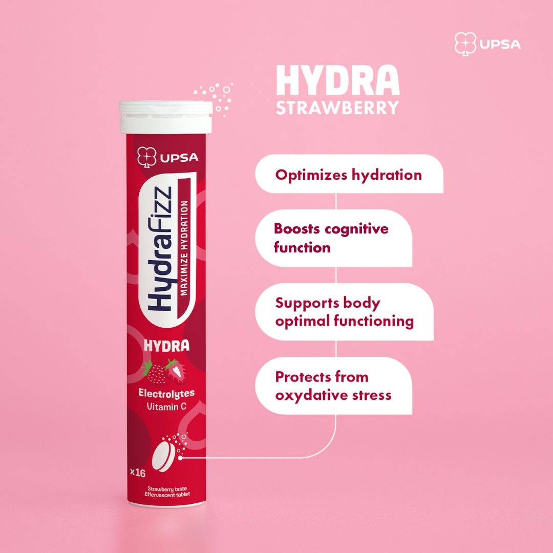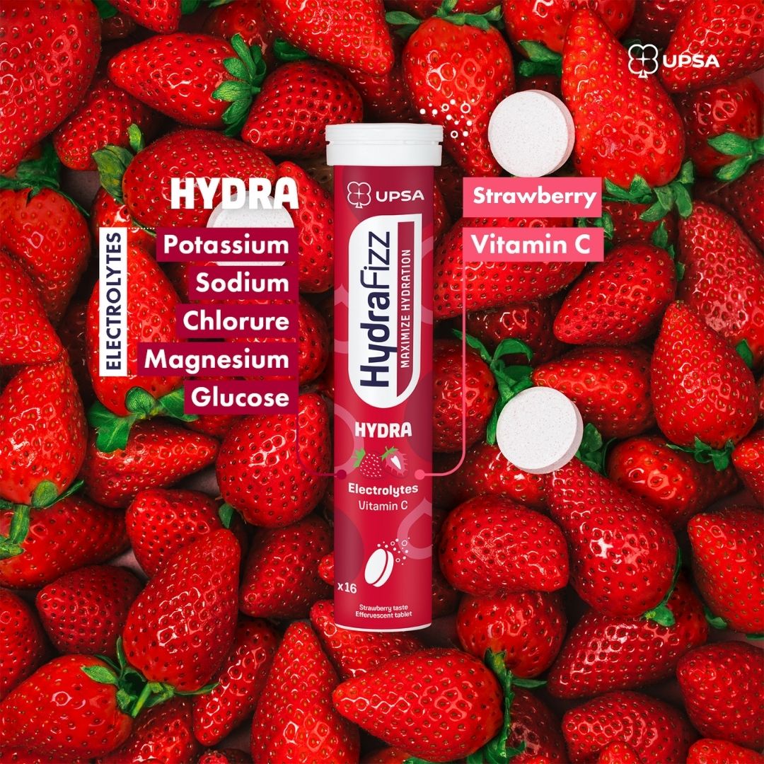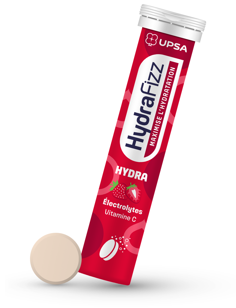 Hydra Strawberry benefits from the expertise of the UPSA pharmaceutical laboratory to optimise your hydration and enhance your well-being. Effective, practical, and delicious, our tablets simplify your hydration routine. Proper hydration contributes to the regulation of body temperature, digestive and nervous system function, the maintenance of blood volume, cell renewal, and toxin elimination. With Hydrafizz Hydra’s delicious strawberry flavour, maximise your hydration and well-being every day!